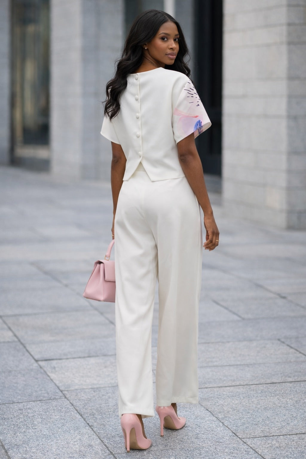 Lightweight floral set with a flowy, boxy short-sleeve top and round neckline with back buttons. Wide-leg pants feature a zip fly, elastic and buttoned waistband, belt loops, darted waist, and pockets for an easy yet polished look.