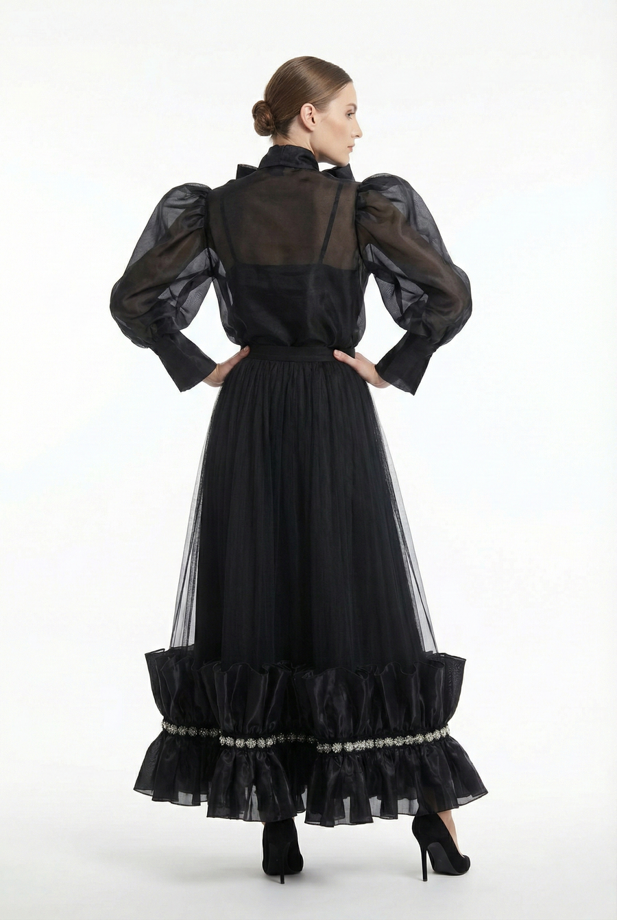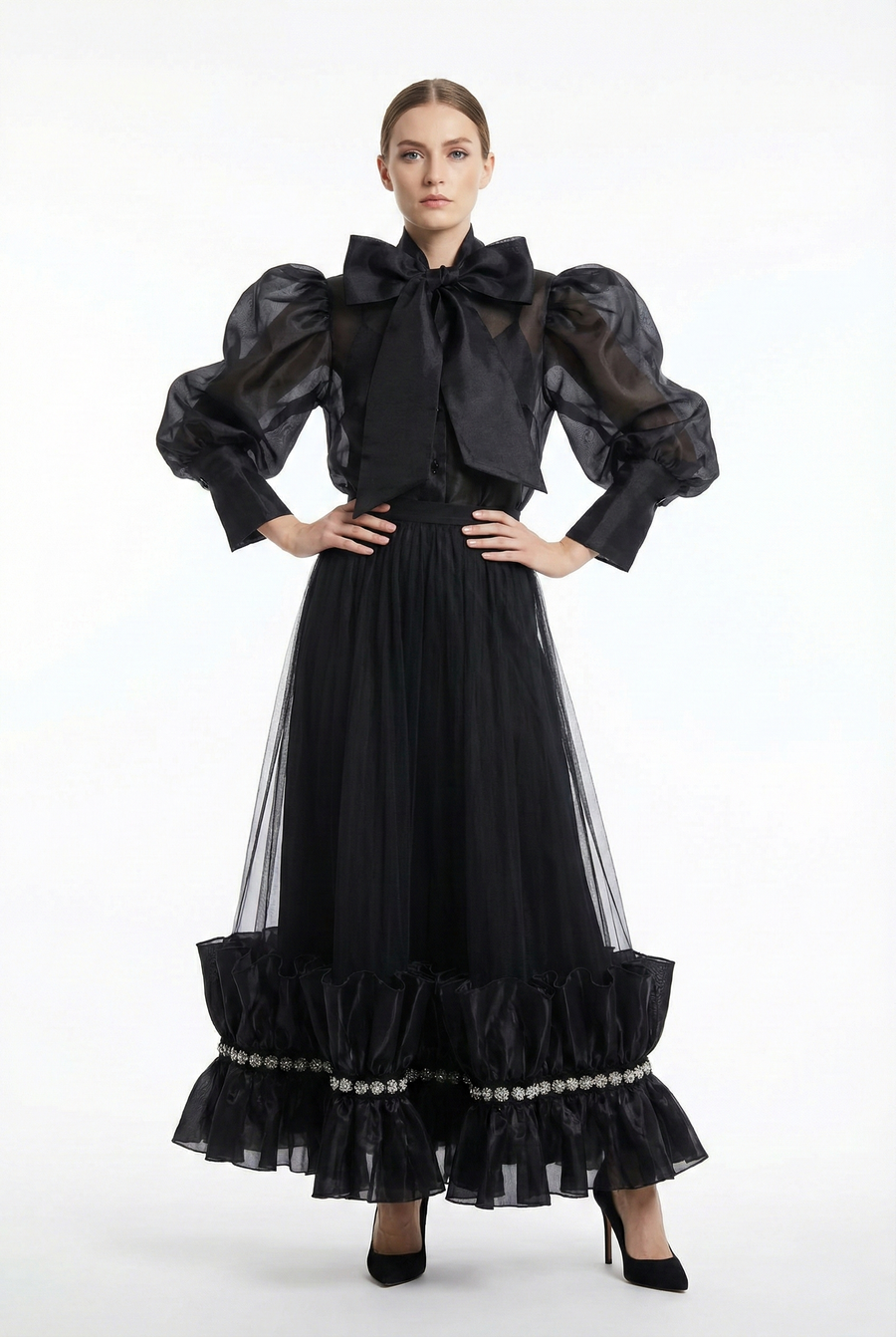 A softly pleated tulle maxi skirt with a comfortable pull-on elastic waistband and full lining. Finished with a ruffled hem accented by delicate beaded banded trim for subtle sparkle. A graceful piece that elevates evening and occasion dressing.