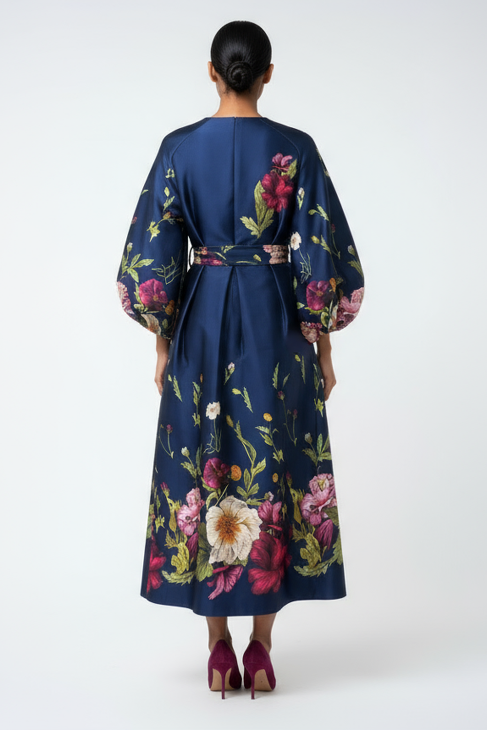 A95116 FLORAL PUFF SLEEVE DRESS (BLK, BLUE)