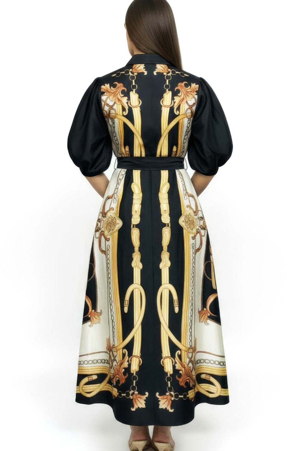 A satin-look maxi dress with a statement chain print. Designed with a wrap belt, puff half sleeves, and functional pockets. Finished with a button-down front for a polished look, this multi-tone style blends elegance with ease.
