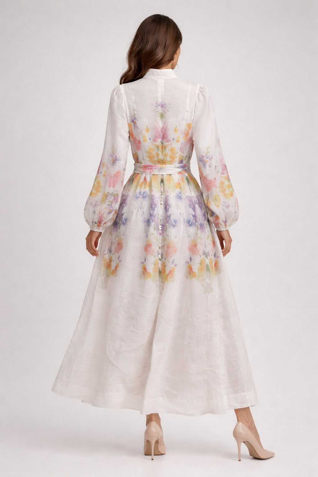 Maxi shirt dress in sheer organza with an abstract watercolor floral print, wrap belt, band collar, elastic sleeves, and loop buttons. Button-down style with included camisole for layered elegance.