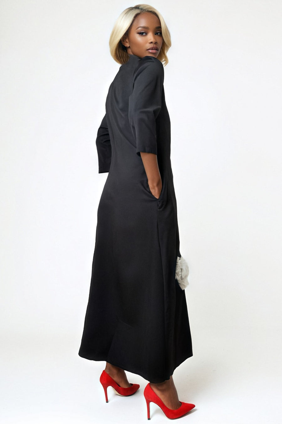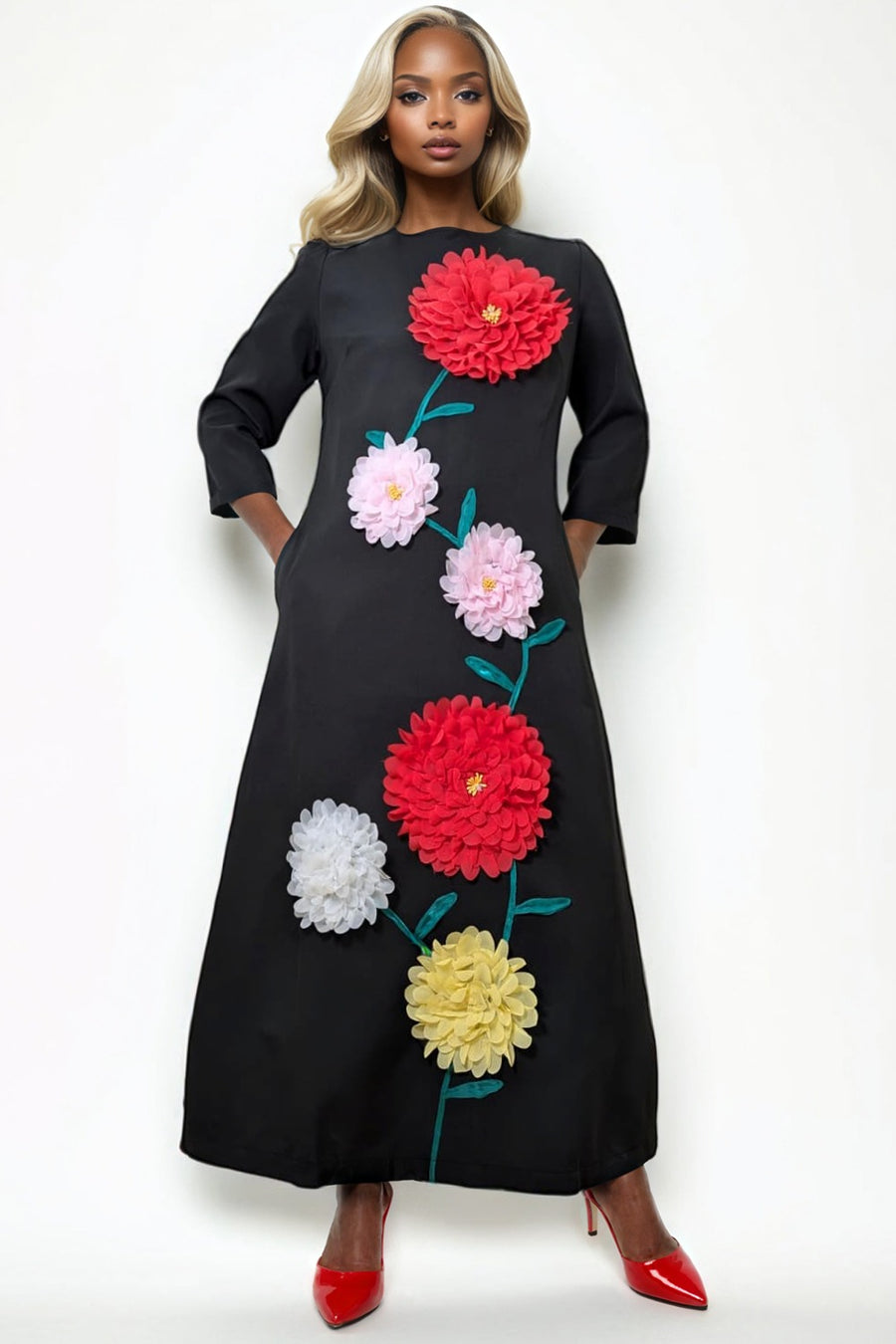 Designed with a round neckline and modest half sleeves, this elegant maxi dress features a relaxed fit through the body, bold flower appliqué for added detail, functional side pockets, and a full back zip for easy wear.