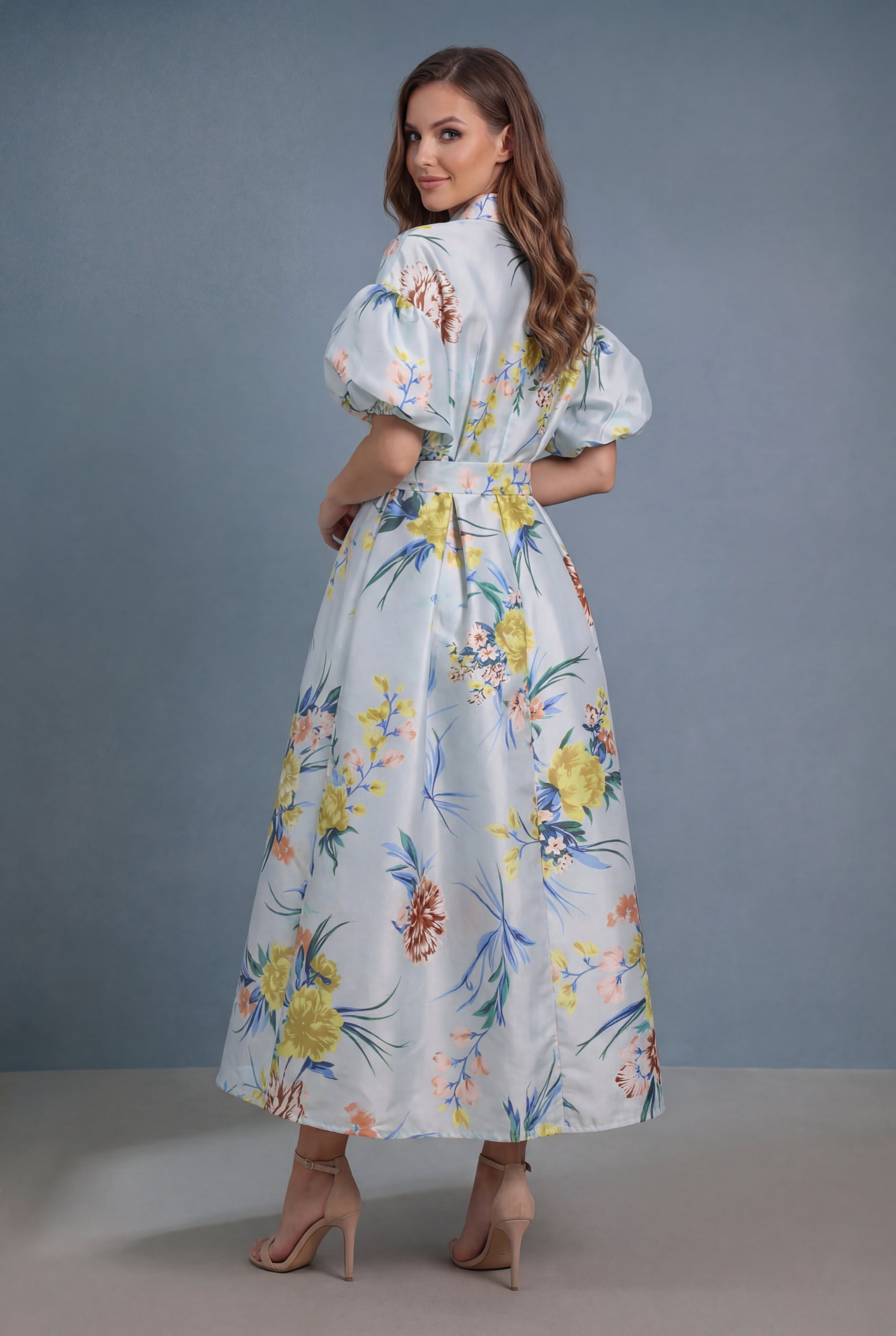 Turn heads in this maxi dress featuring a mellow floral print, puffed short sleeves, and a button-down front. Designed with a flattering wrap belt, functional pockets, and a collar for a perfect mix of style and comfort.