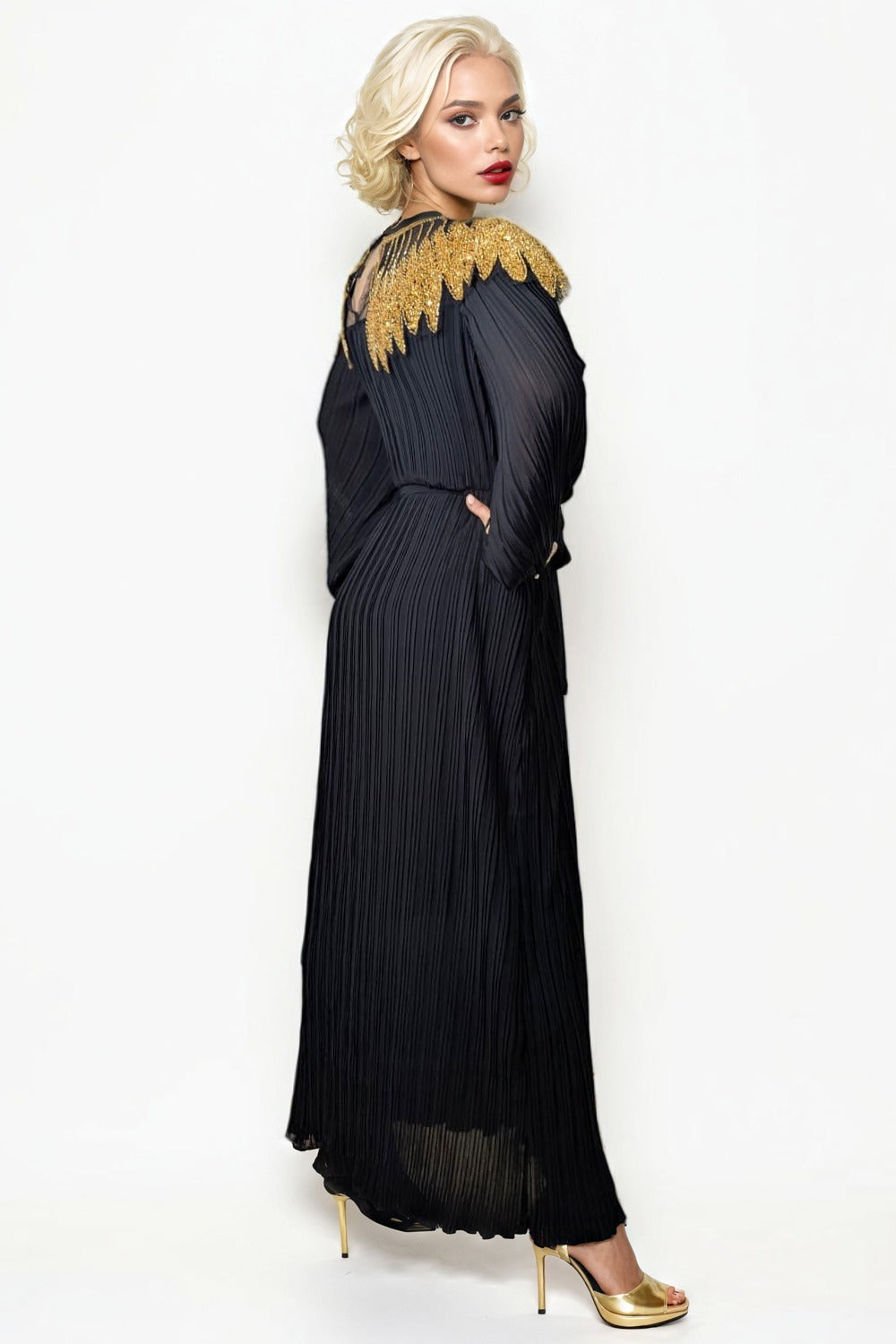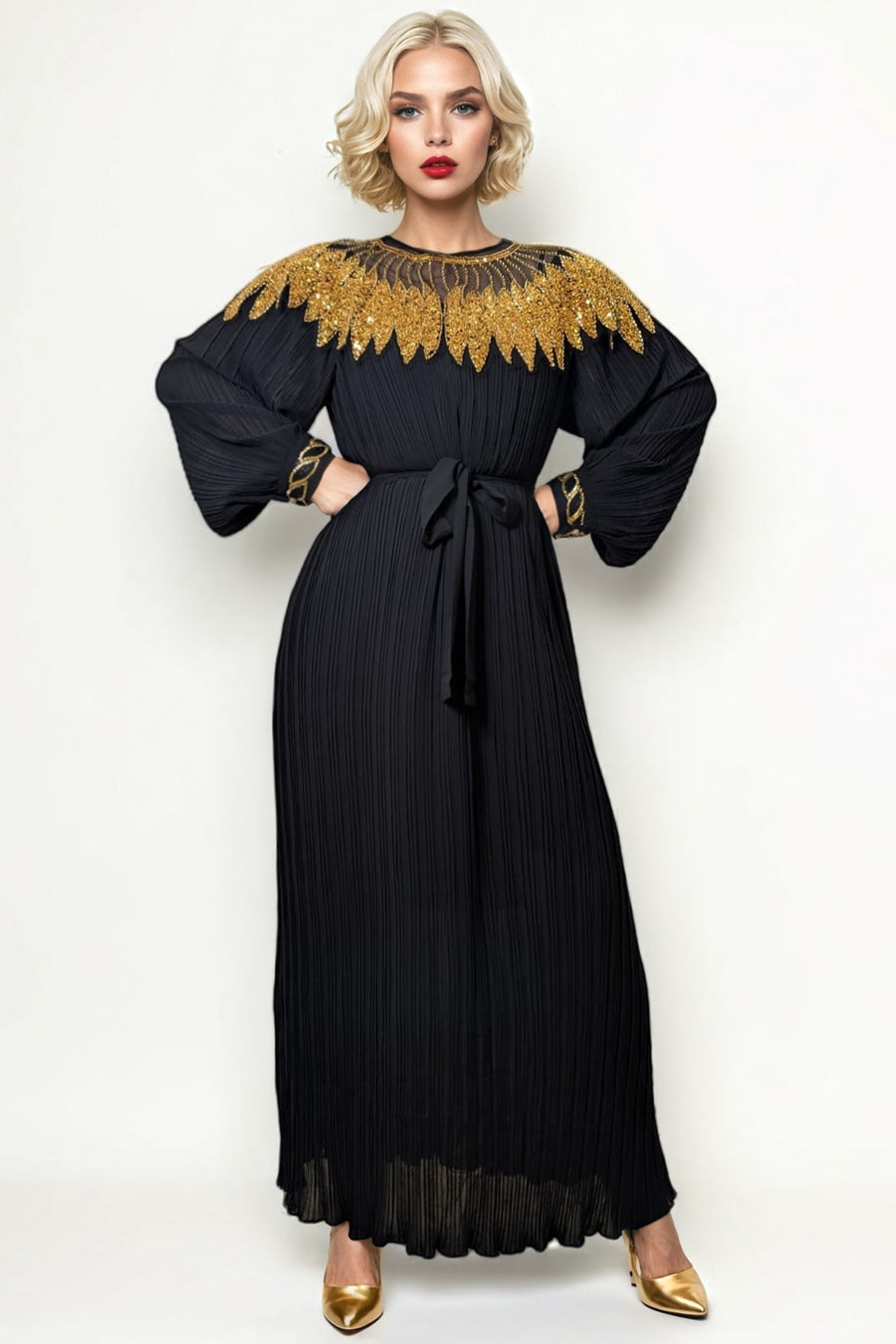 W52501 REGAL APPLIQUE PLEATED DRESS