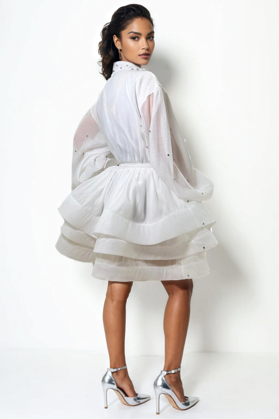 Shine with effortless charm in this layered mini dress, designed with a crisp collar, long sleeves, and a flattering bell shape. Embellished with rhinestone studs and paired with a camisole, it’s the perfect mix of playful and polished.
