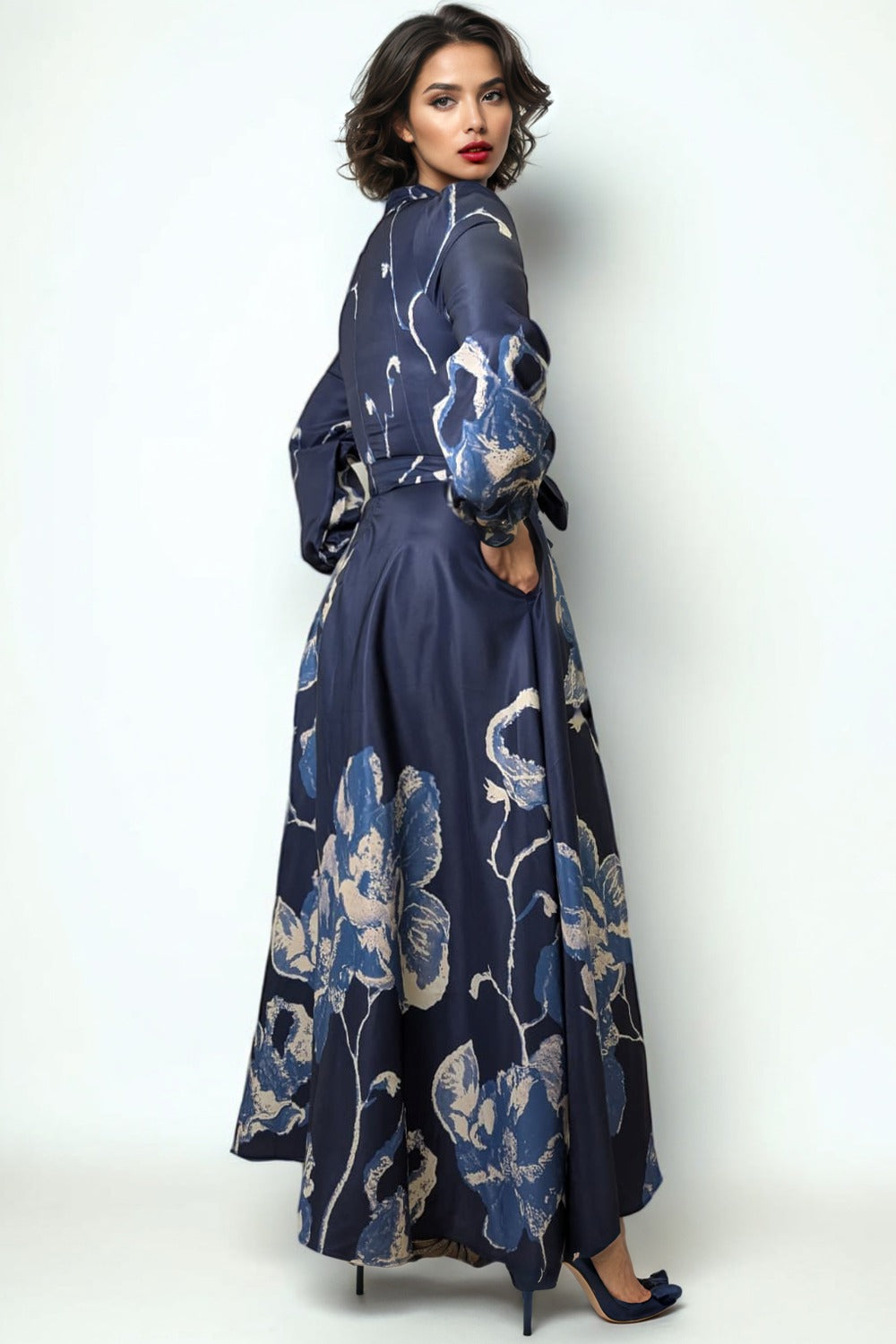 Effortlessly chic maxi dress with a flattering belt and elegant stand collar. Featuring a tonal floral print, long sleeves, and convenient pockets, this dress combines style and comfort for any occasion. Crafted with a beautiful satin finish.