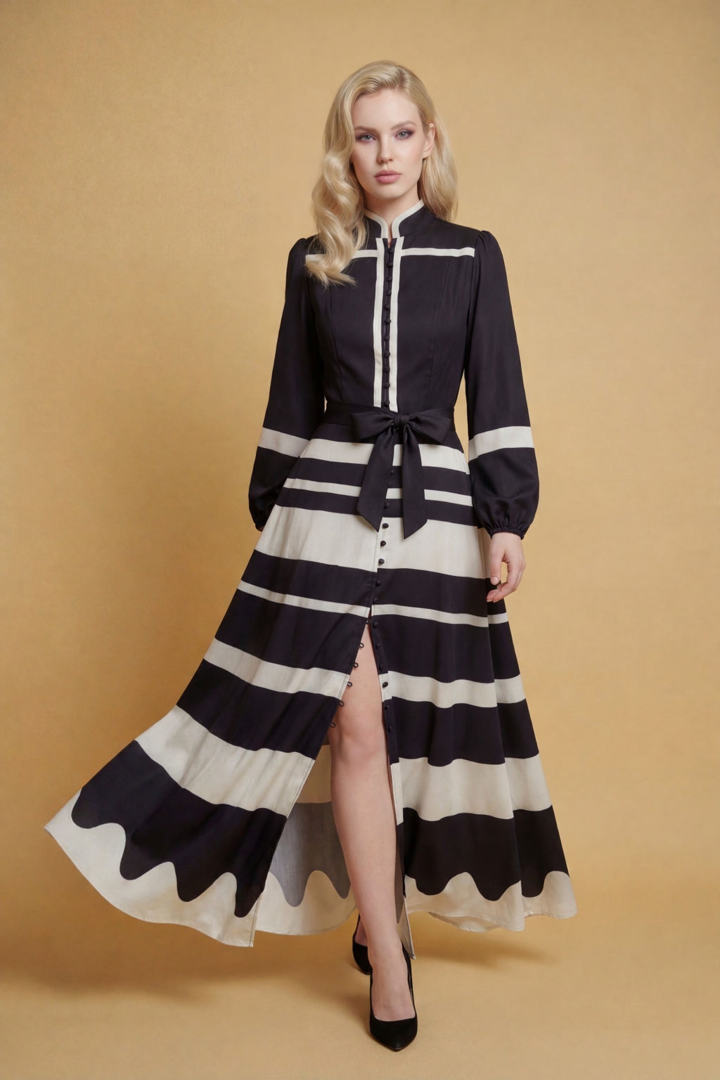 Multicolor maxi dress with a polished mandarin collar and long sleeves finished with elasticized cuffs. detailed with a button-down button loops design, functional pockets, a flattering wrap belt at the waist, and a concealed back zipper for a clean, tailored...