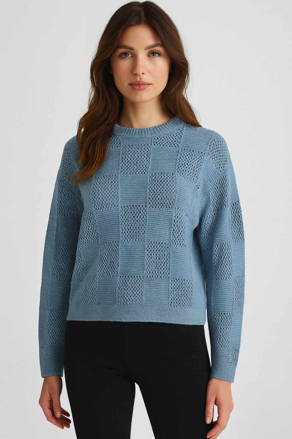 A modest textured knit sweater designed with a classic crew neckline and long sleeves. Crafted in a comfortable midweight knit, it offers subtle dimension and breathable warmth, making it ideal for effortless spring layering and everyday polished wear.
