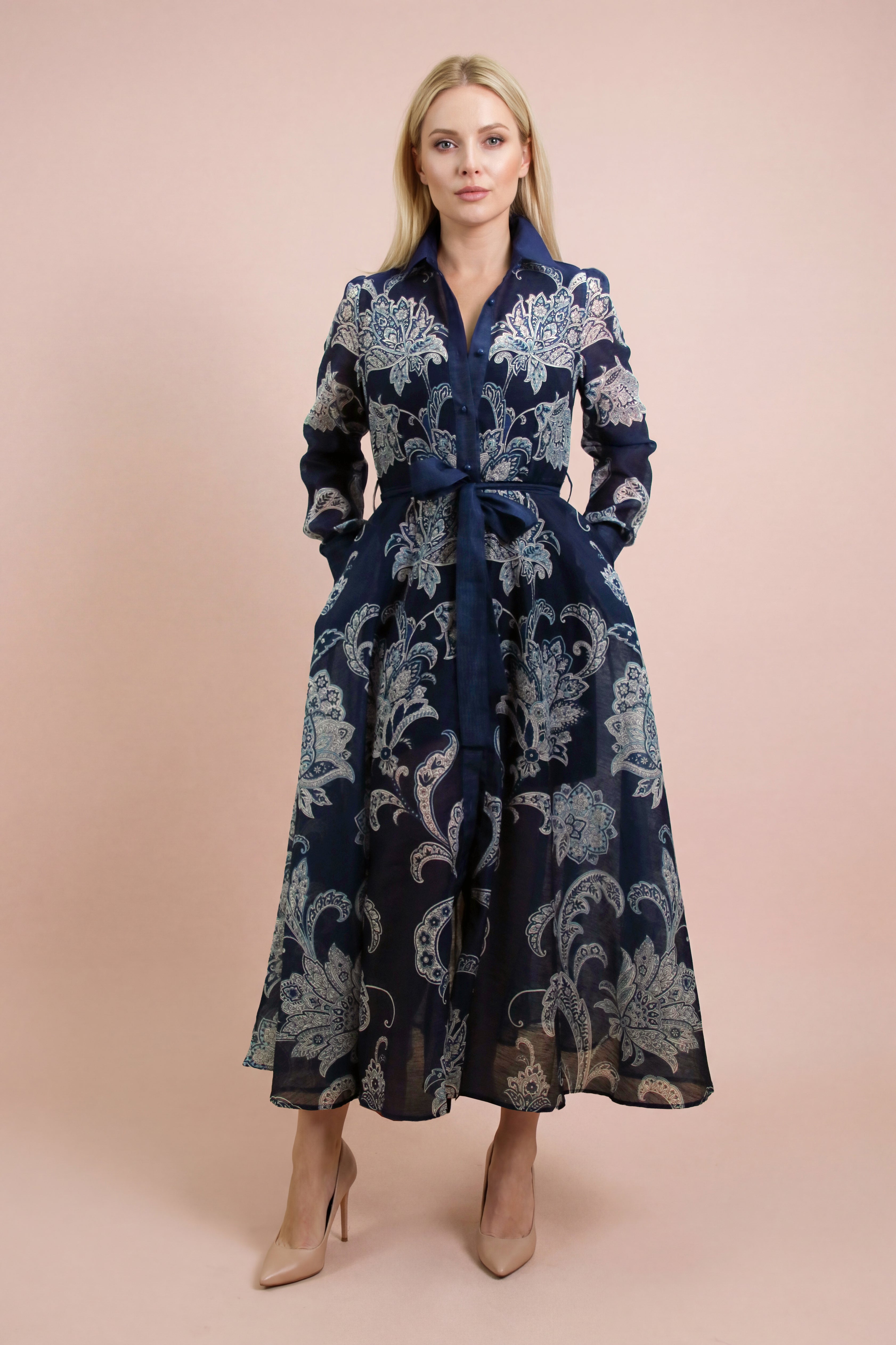 A refined take on the classic shirt dress, this paisley-print midi features a crisp collar, button-front design, and long sleeves with cuffed finishes. A removable wrap belt defines the waist, while the included camisole offers comfortable, confident coverage.