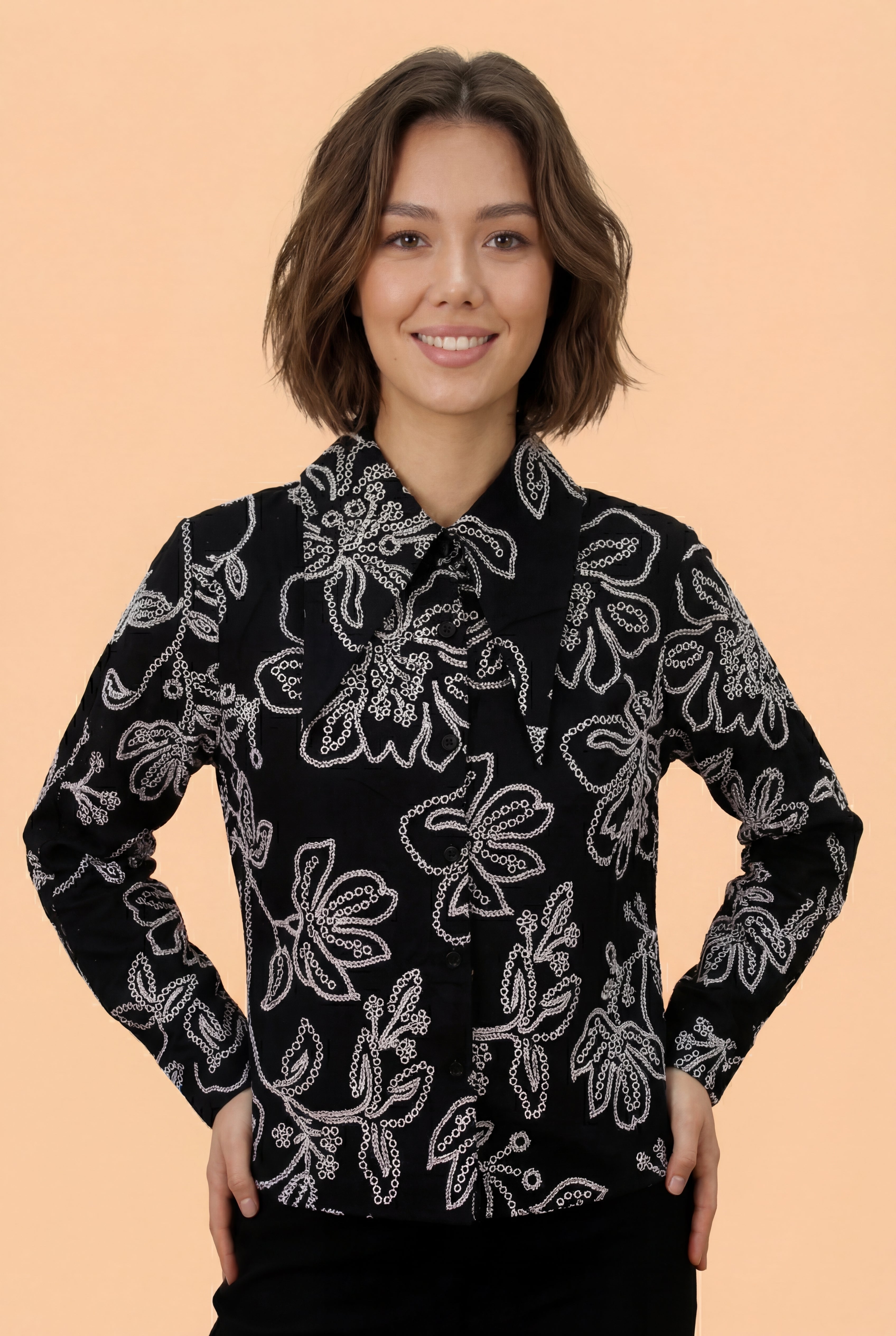 A floral print blouse featuring a pointed collar detail, long sleeves, eyelet design and a classic button-front silhouette an easy polished piece for day-to-night styling.