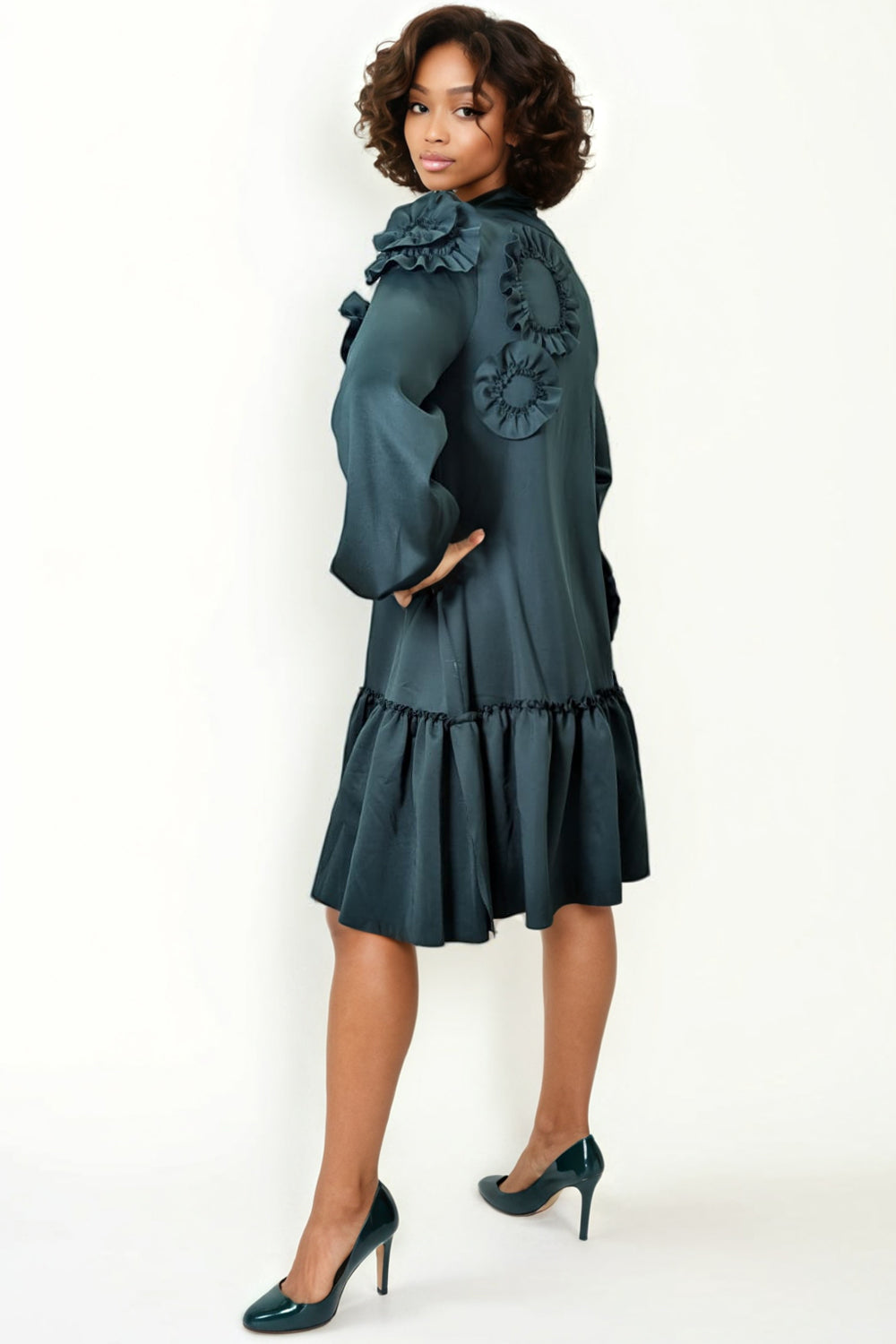 This midi dress combines effortless style with comfort. Featuring long sleeves with elastic ends, delicate ruffle flower details, and a pullover design, it’s a solid choice for everyday wear or special occasions.