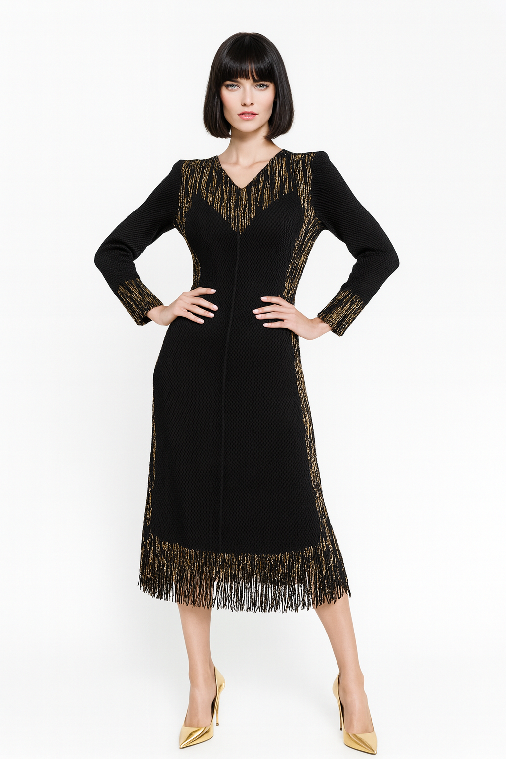 A crinkled multi-tone dress defined with long sleeves, a cinched wrap belt, and a sleek stretch fit. Luxe metallic accents and cascading fringe give this piece a bold, couture-inspired finish.