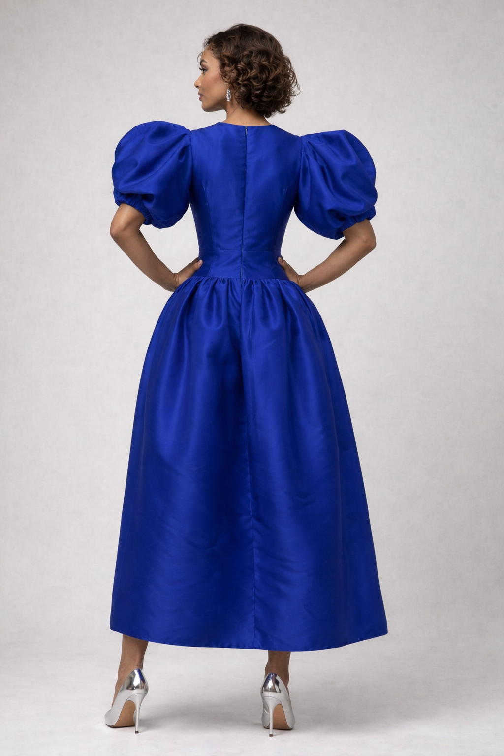 Elegant maxi gown with a square neck, puffed sleeves with elastic ends, and back zipper. Features side pockets and a sheer mesh chest panel adorned with rhinestones forming butterflies for a striking finish.