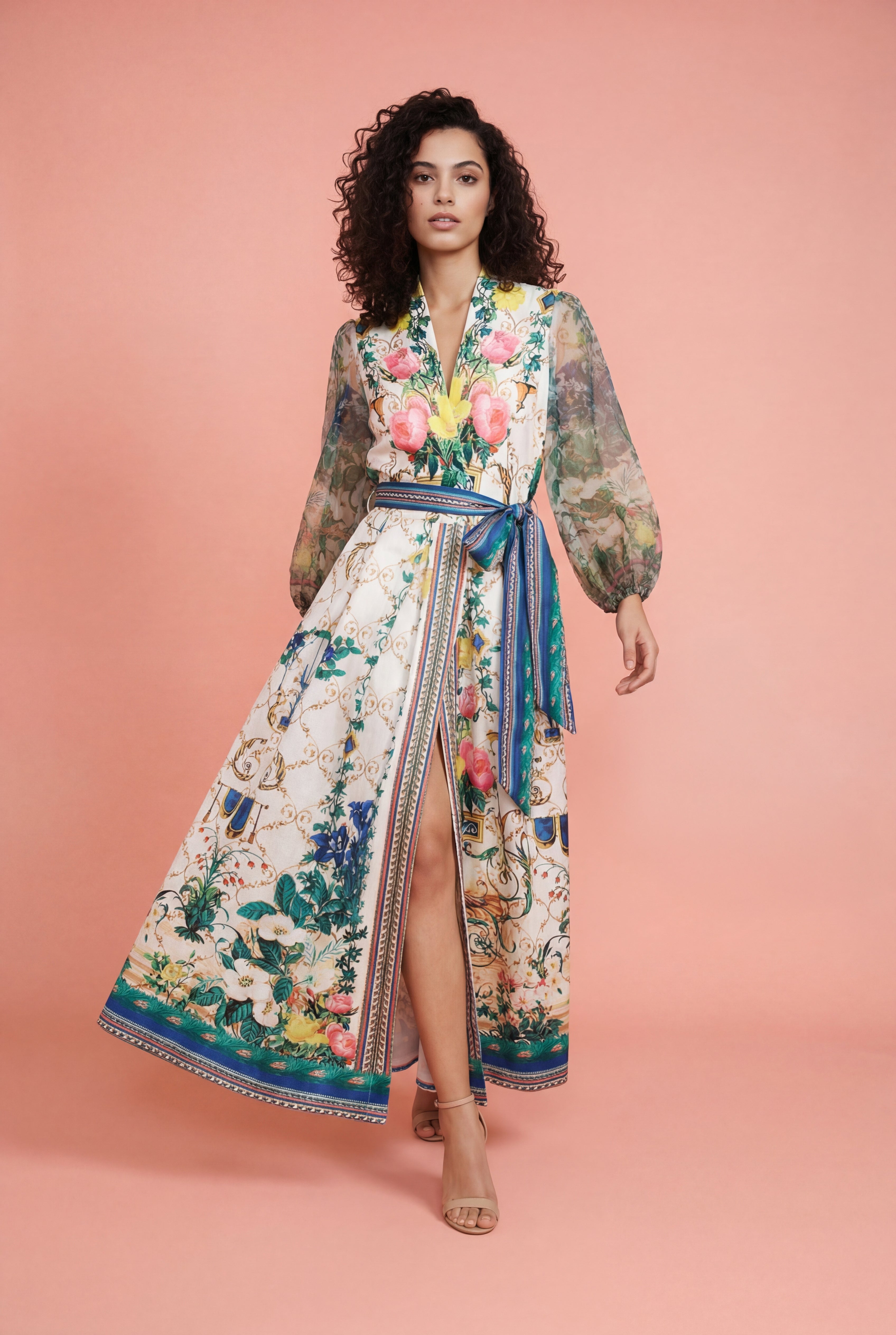 A floral wrap dress designed with a flattering V-neckline, long sheer sleeves, and a vibrant multi-color print. Finished with a side tie closure that defines the waist and functional pockets, this lightweight style offers comfort and effortless wear.