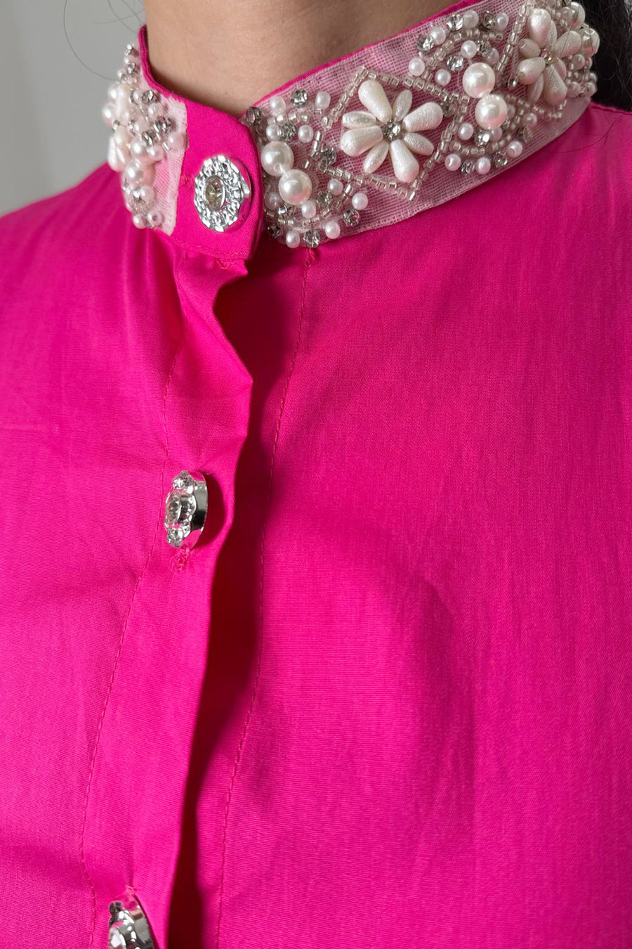This cotton midi shirt dress is adorned with dazzling rhinestones, pearls and beads and silver buttons, with long marie sleeves and elastic cuffs. A timeless silhouette with standout details that add just the right touch of charm.