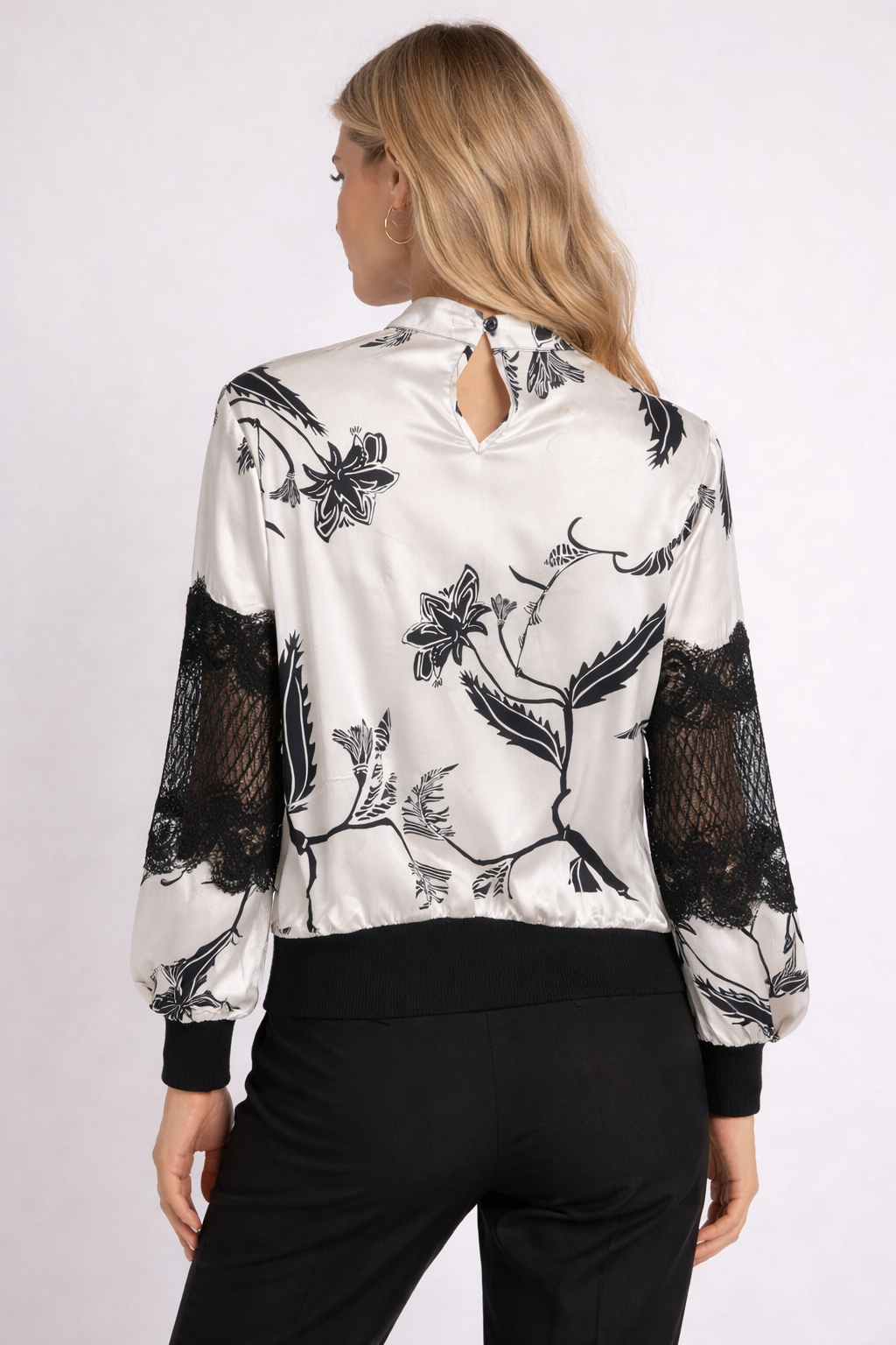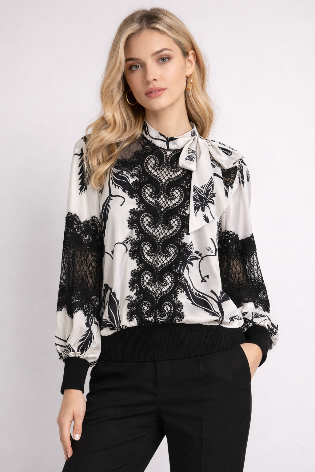 T81123 LACE-PANEL TIE-NECK TOP